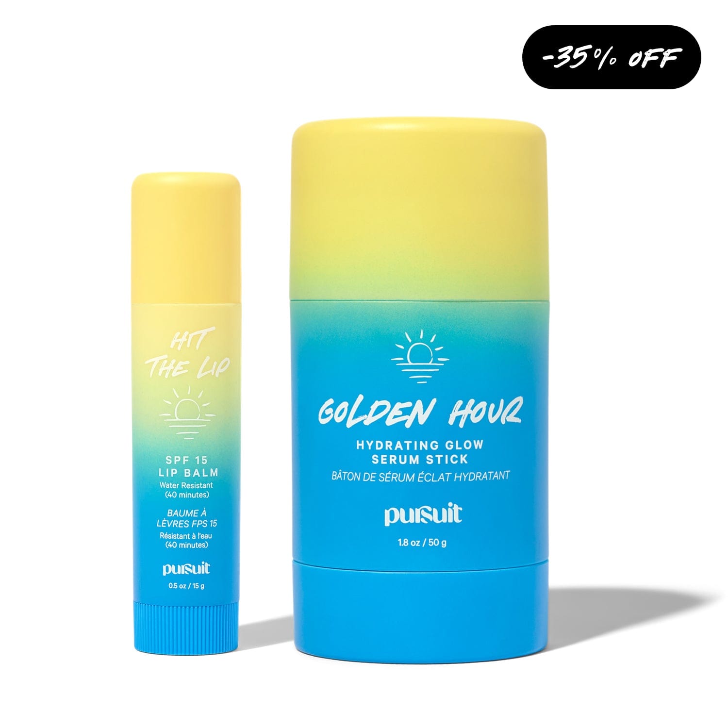 The amazing and unique glow stick Golden Hour matched with the delicious, Mango flavored, smooth-as-silk Hit The Lip - SPF 15 Lip Balm.